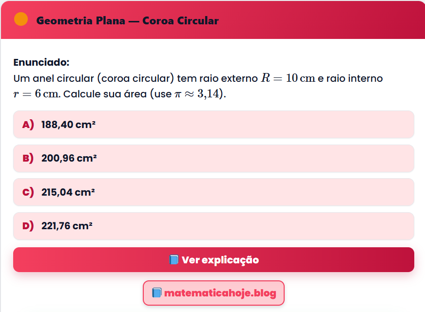 Continue lendo🟠 Geometria Plana — Coroa Circular Enunciado: Um anel circular (coroa circular) tem raio externo \(R=10\,\text{cm}\) e raio interno \(r=6\,\text{cm}\).