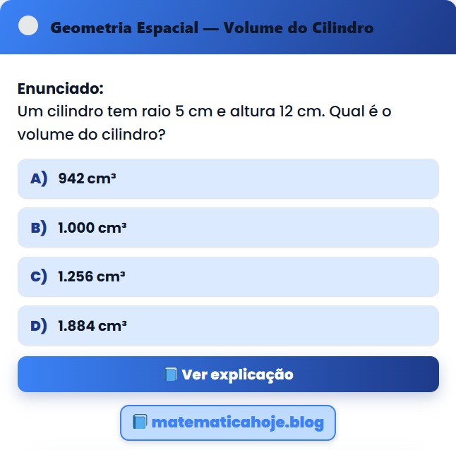 Continue lendo⚪ Geometria Espacial — Volume do Cilindro Enunciado: Um cilindro tem raio 5 cm e altura 12 cm. Qual é