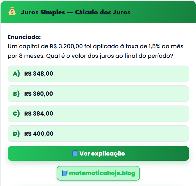 Continue lendo💰 Juros Simples — Cálculo dos Juros Enunciado: Um capital de R$ 3.200,00 foi aplicado à taxa de 1,5% ao