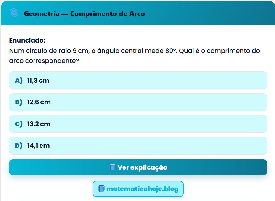 Continue lendo🌀 Geometria — Comprimento de Arco Enunciado: Num círculo de raio 9 cm, o ângulo central mede 80°. Qual é