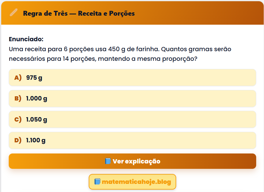 Continue lendo🥖 Regra de Três — Receita e Porções Enunciado: Uma receita para 6 porções usa 450 g de farinha. Quantos