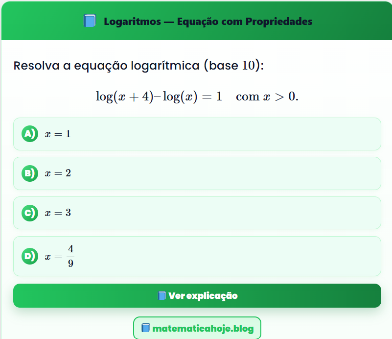 Continue lendo📘 Logaritmos — Equação com Propriedades Resolva a equação logarítmica (base \(10\)): \[ \log(x+4) – \log(x) = 1 \quad \text{com