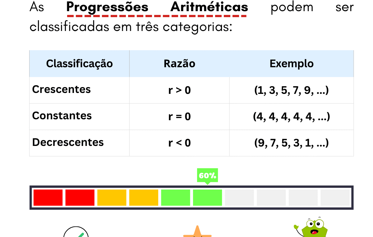 Continue lendoClassificação de Progressão Aritmética (P.A.) — Crescente, Constante e Decrescente Classificação de Progressão Aritmética (P.A.) A classificação de uma Progressão