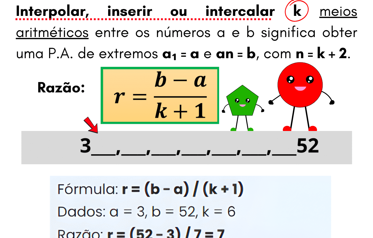 Continue lendoInterpolação Aritmética — Como inserir meios aritméticos em P.A. Interpolação Aritmética Interpolar (inserir) k meios aritméticos entre a e b
