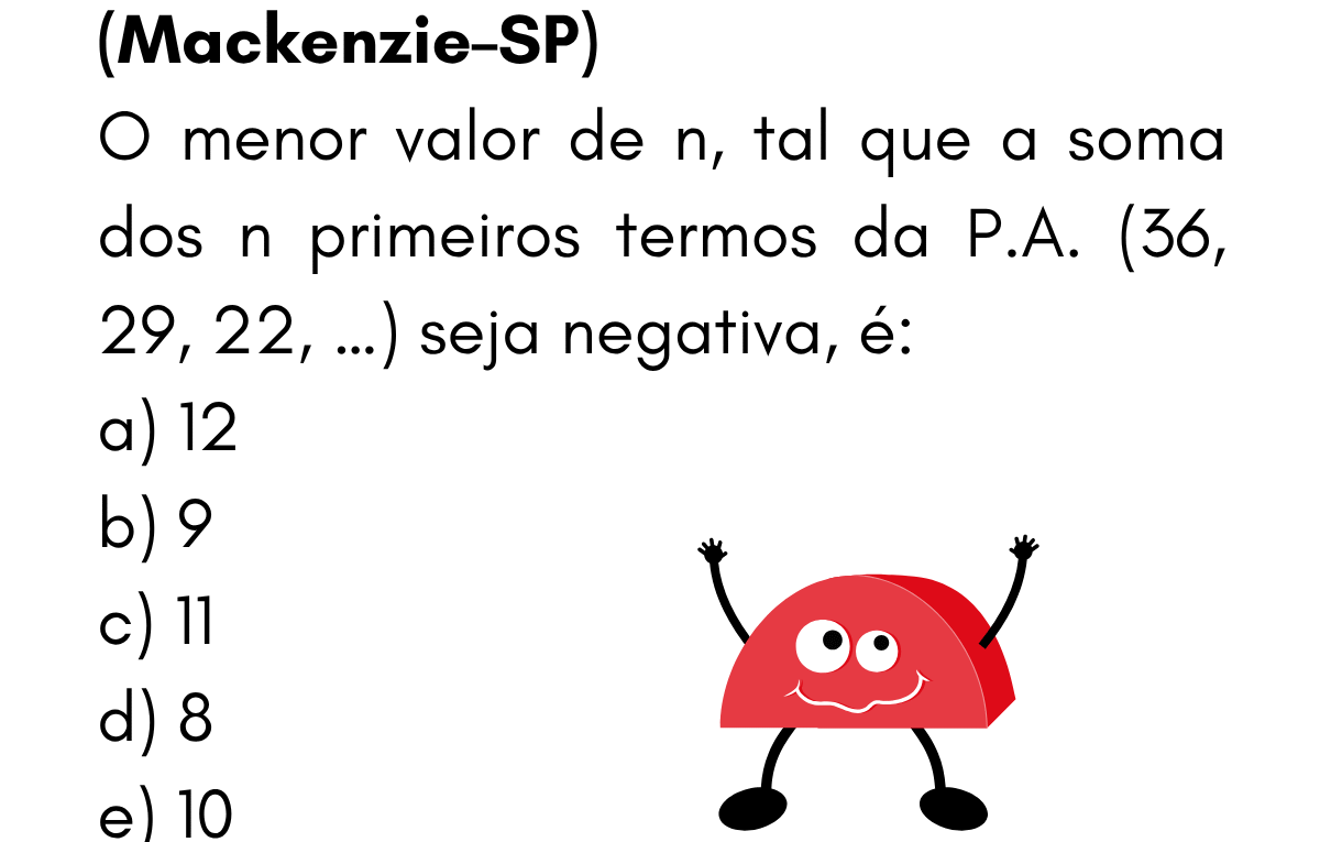 Continue lendoPA — Questão 11 (Mackenzie-SP) • Menor n para Sₙ negativo Questão 11 — Menor \(n\) para \(S_n<0\) (Mackenzie-SP) PA