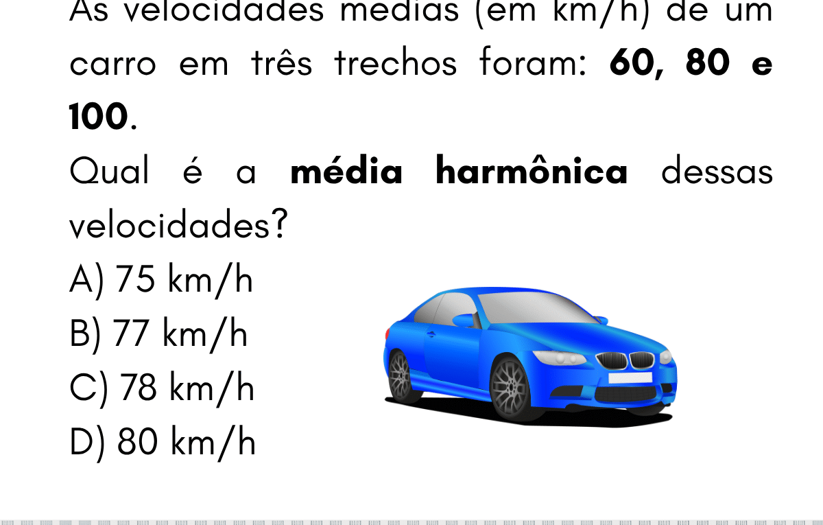 Continue lendo🚗 Médias — Média Harmônica de Velocidades As velocidades médias (em km/h) de um carro em três trechos foram: 60,