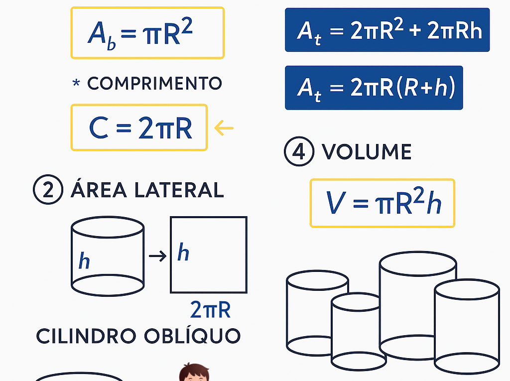 Continue lendoFórmulas do Cilindro: Área da Base, Área Lateral, Área Total e Volume (com exemplos e exercícios) Fórmulas do Cilindro —