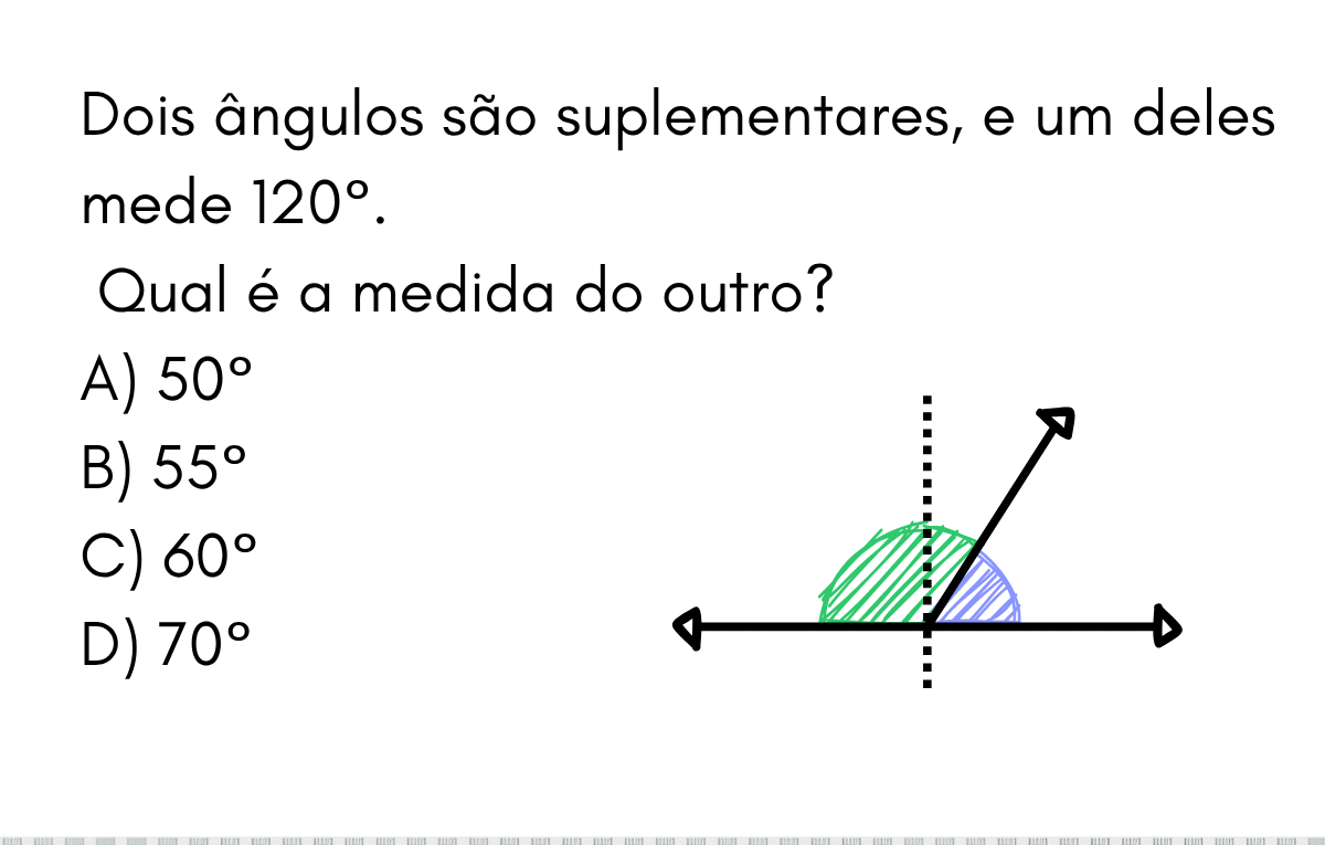 Continue lendo📐 Geometria Plana — Ângulos Suplementares Dois ângulos são suplementares, e um deles mede 120°. Qual é a medida do