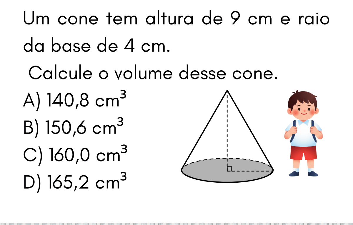 Continue lendo🧮 Geometria Espacial — Volume do Cone Um cone tem altura \(h=9\) cm e raio \(r=4\) cm. Calcule o volume
