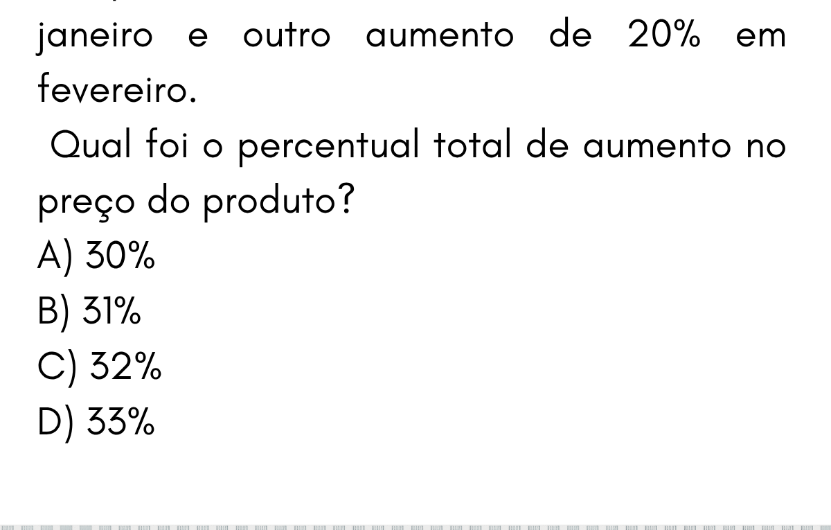 Continue lendo📈 Porcentagem — Aumento Sucessivo Um produto teve um aumento de 10% em janeiro e outro aumento de 20% em