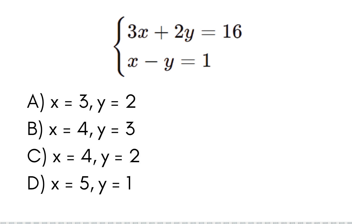 Continue lendo🧩 Sistemas Lineares — Resolução por Substituição Resolva o sistema: \[ \begin{cases} 3x + 2y = 16\\ x – y