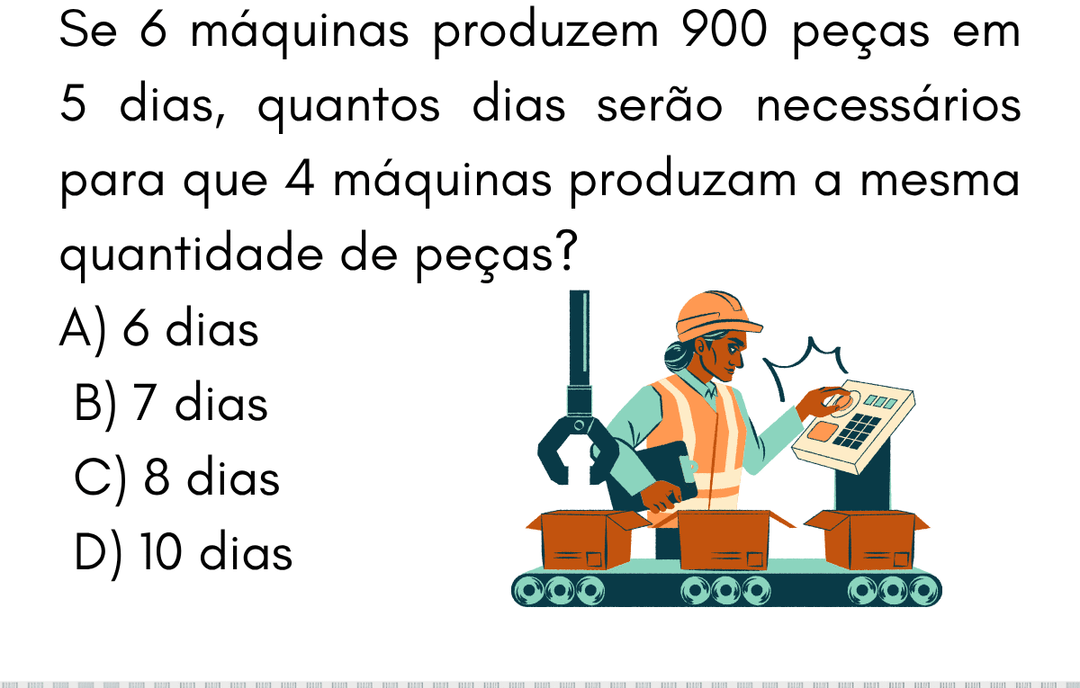 Continue lendo⚙️ Regra de Três Composta — Produção e Tempo Se 6 máquinas produzem 900 peças em 5 dias, quantos dias