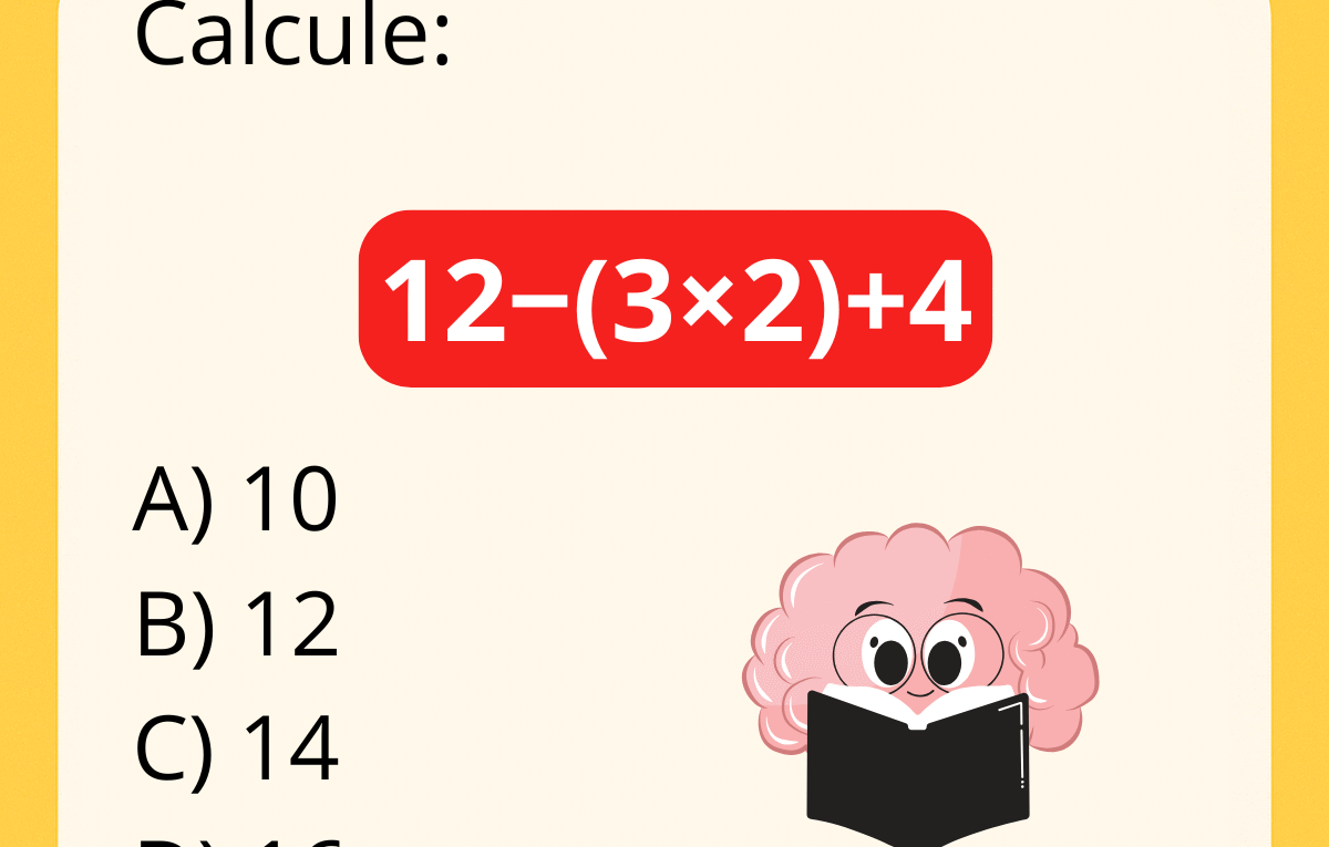 ⚡ DESAFIO RÁPIDO Expressões numéricas — ordem das operações Calcule: \(12 – (3 \times 2) + 4\) A) 10 B)