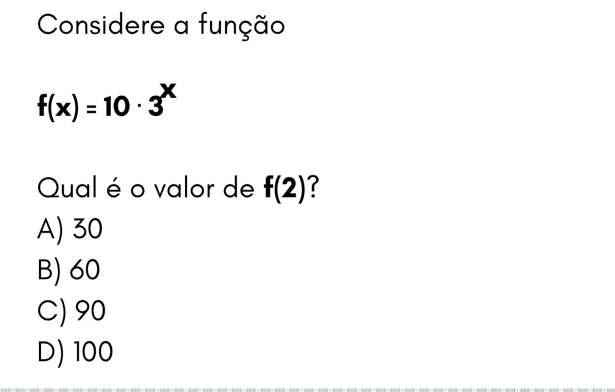 Continue lendo⚡ DESAFIO RÁPIDO Função exponencial — calcule f(2) Considere a função \(f(x)=10\cdot 3^x\). Qual é o valor de f(2)? A)