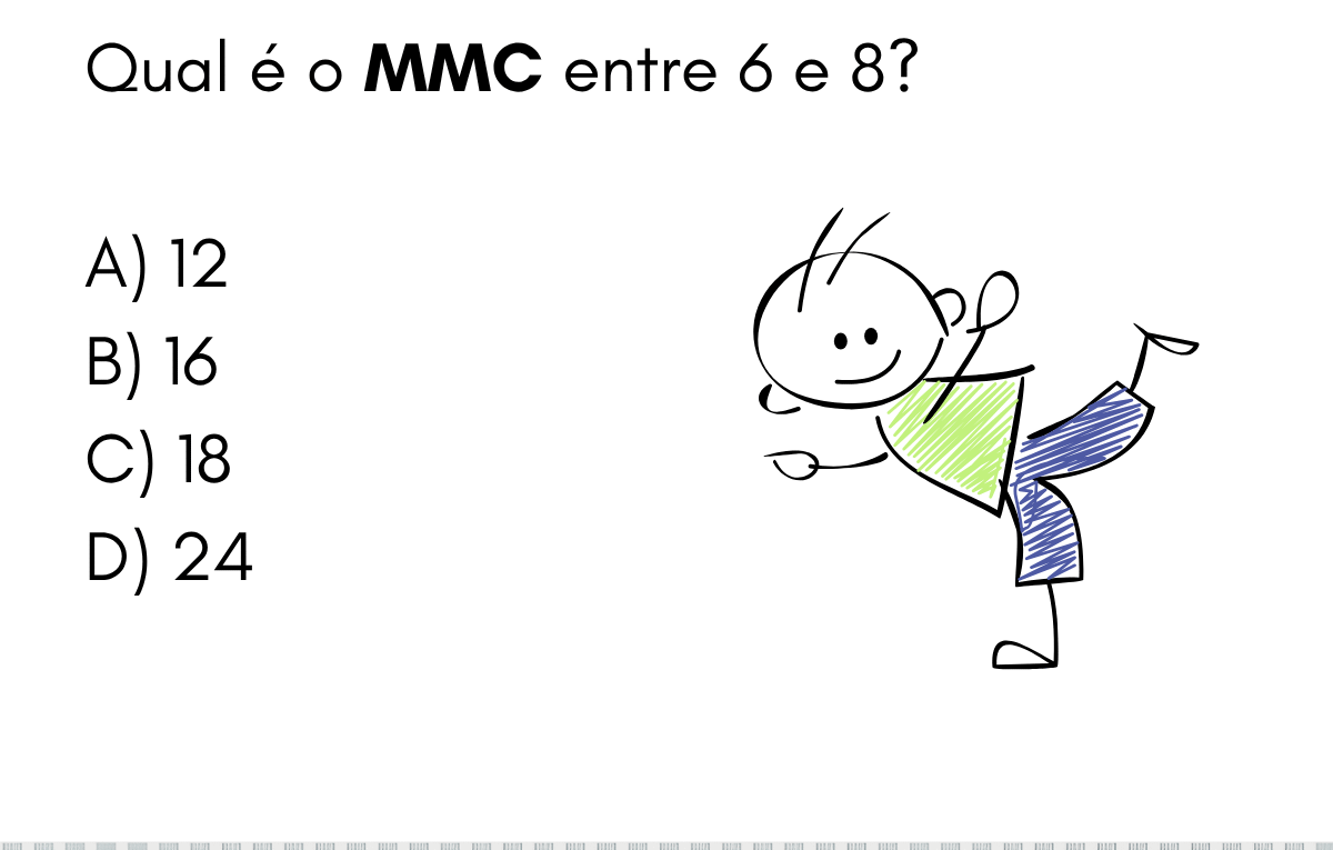 Continue lendoMínimo Múltiplo Comum — Você acerta esta? Qual é o MMC entre os números 6 e 8? A) 12 B)