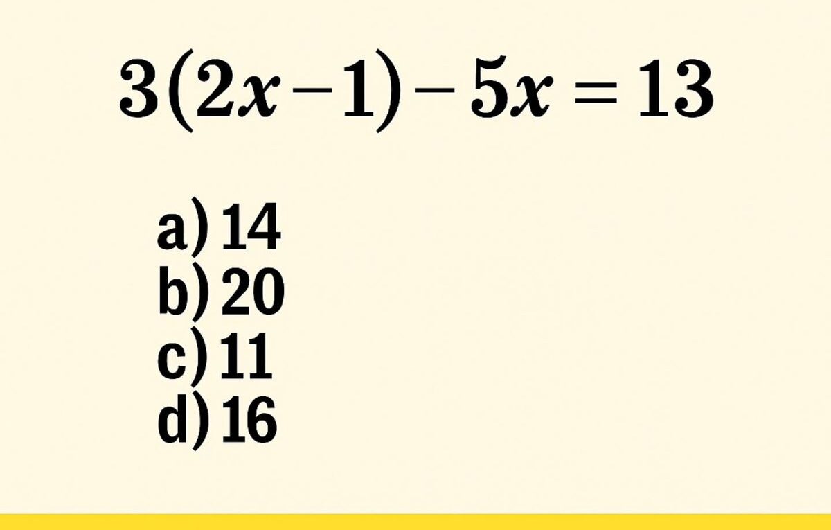 Continue lendoMostrar solução passo a passo 📌 Solução comentada A equação apresentada é: \[ 3(2x – 1) – 5x = 13