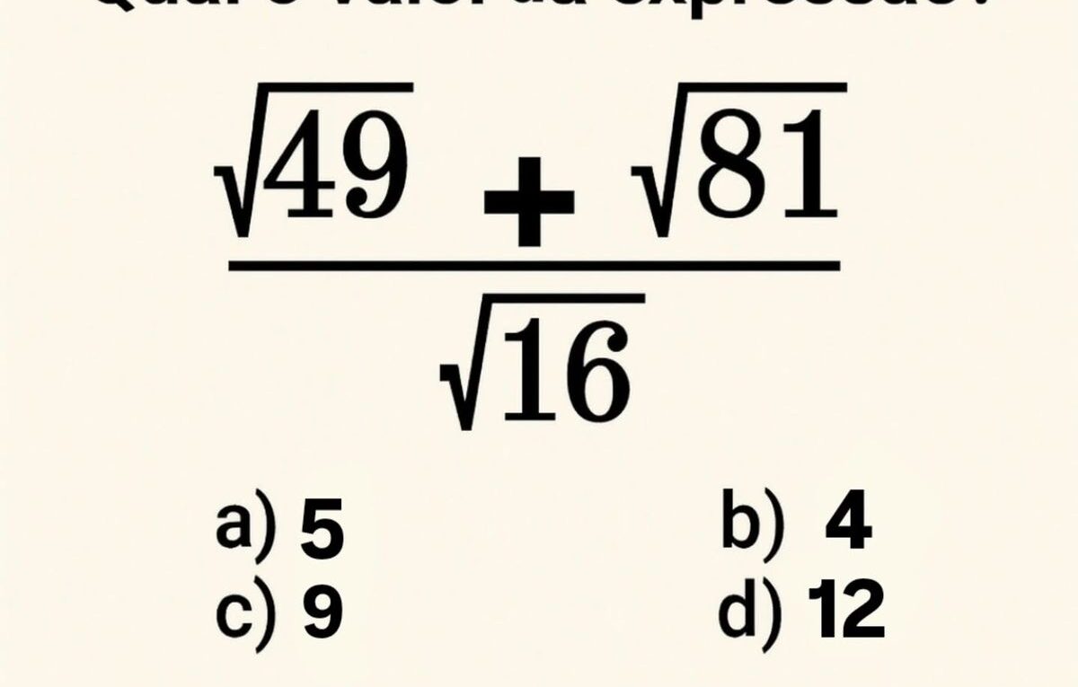 Continue lendoMostrar solução passo a passo 📌 Solução comentada A expressão da imagem pode ser escrita assim: \[ \dfrac{\sqrt{49} + \sqrt{81}}{\sqrt{16}}