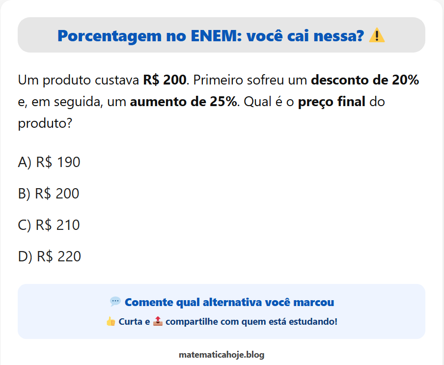 Continue lendoPorcentagem no ENEM: desconto e aumento seguidos confundem muita gente Porcentagem é um dos temas mais recorrentes no ENEM e