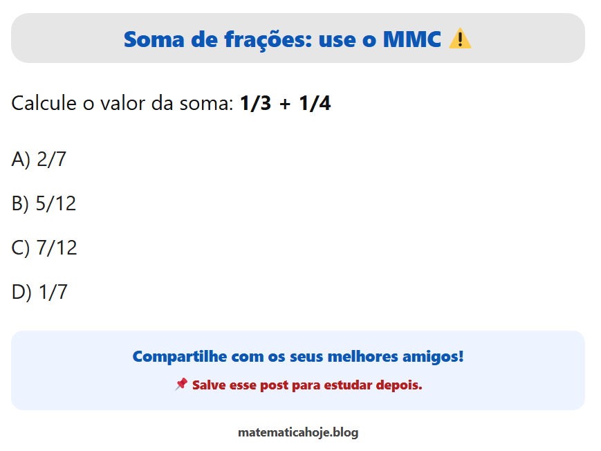 Continue lendoSoma de frações: cuidado com o denominador Para somar frações com denominadores diferentes, é necessário usar o MMC. O erro