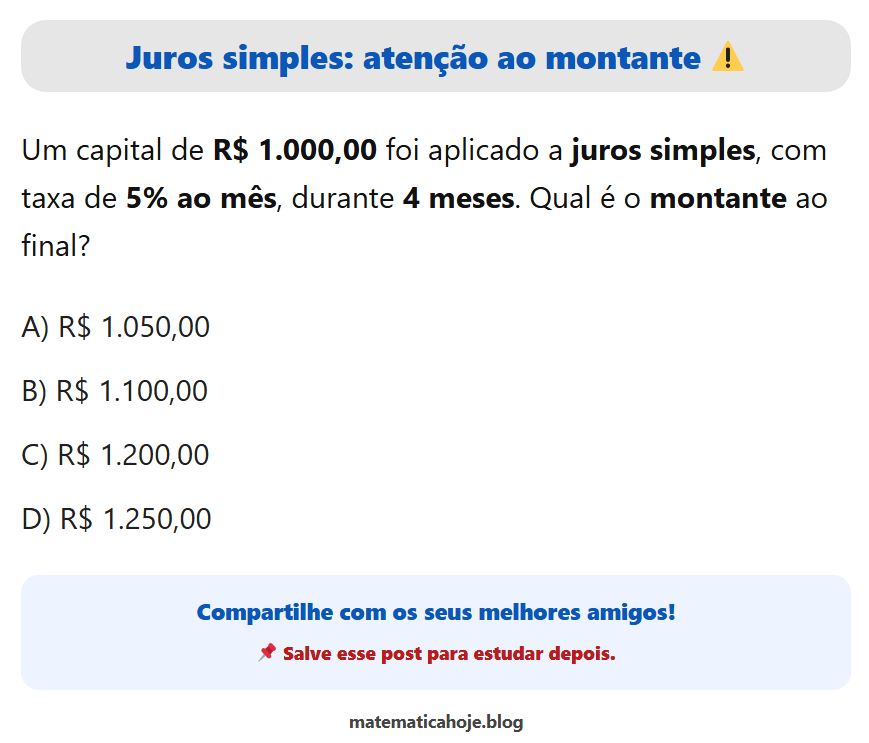 Continue lendoJuros simples: cuidado com o montante Em juros simples, os juros são calculados sempre sobre o capital inicial. O erro