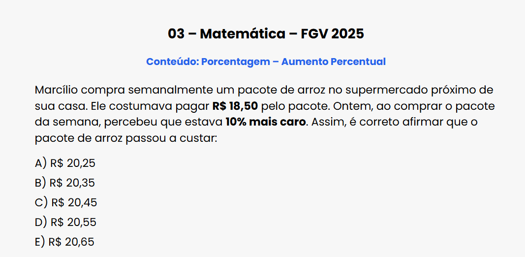 Continue lendo03 – Matemática – FGV 2025 | Aumento Percentual 03 – Matemática – FGV 2025 Conteúdo: Porcentagem – Aumento Percentual