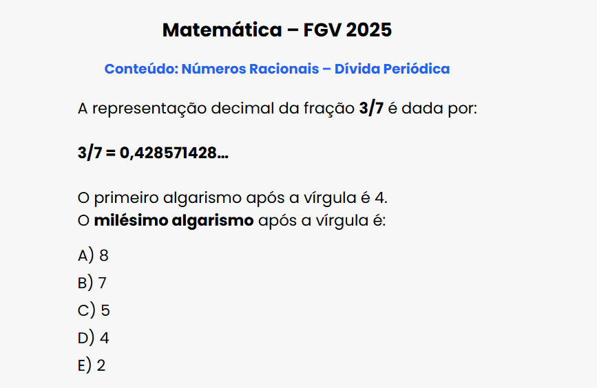 Matemática – FGV 2025 | Fração 3/7 em forma decimal Matemática – FGV 2025 Conteúdo: Números Racionais – Dívida Periódica
