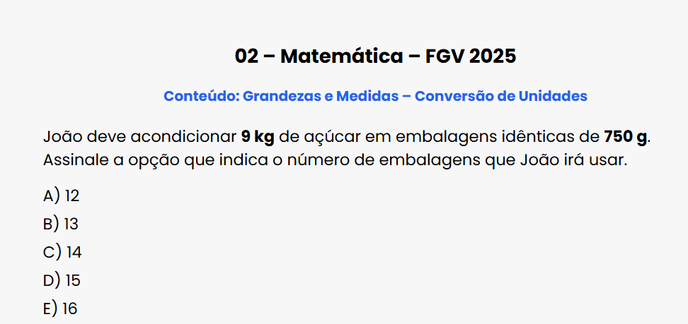 Continue lendo02 – Matemática – FGV 2025 | Embalagens de Açúcar 02 – Matemática – FGV 2025 Conteúdo: Grandezas e Medidas
