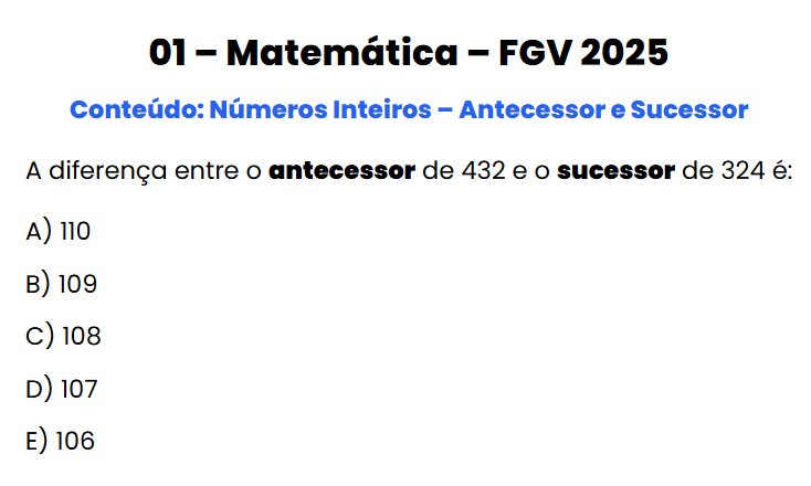 Continue lendo01 – Matemática – FGV 2025 | Antecessor e Sucessor 01 – Matemática – FGV 2025 Conteúdo: Números Inteiros –