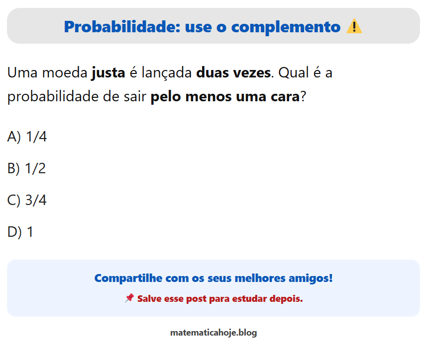 Continue lendoProbabilidade: pelo menos uma cara Em probabilidade, “pelo menos um” geralmente fica mais fácil usando o complemento (o contrário do