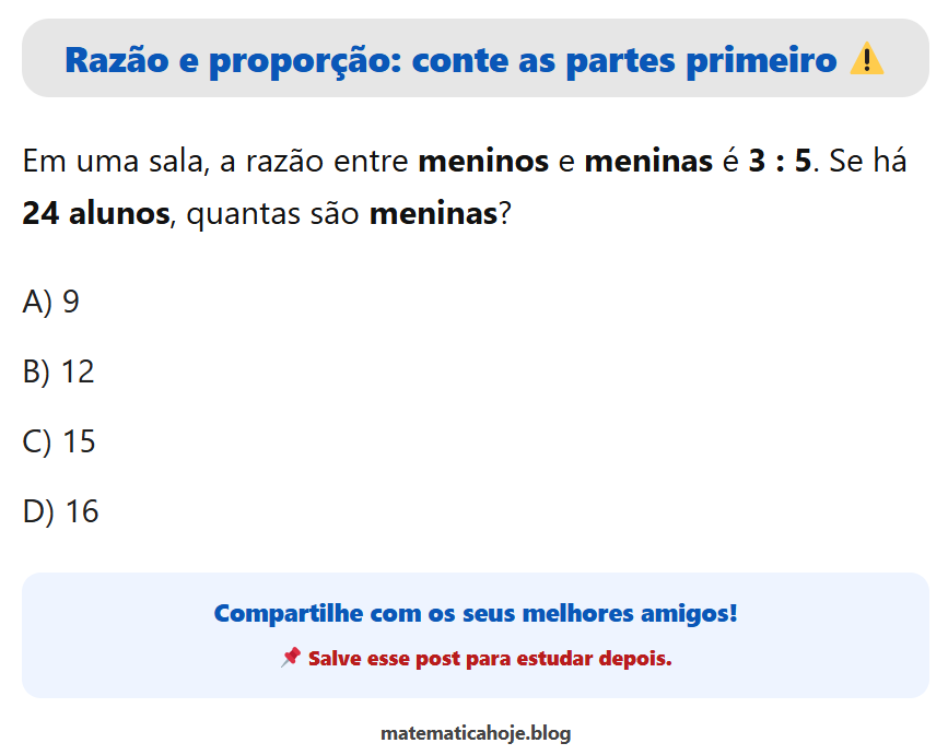 Continue lendoRazão e proporção: meninos e meninas Em razão, comparamos partes de um todo. O erro mais comum é não somar