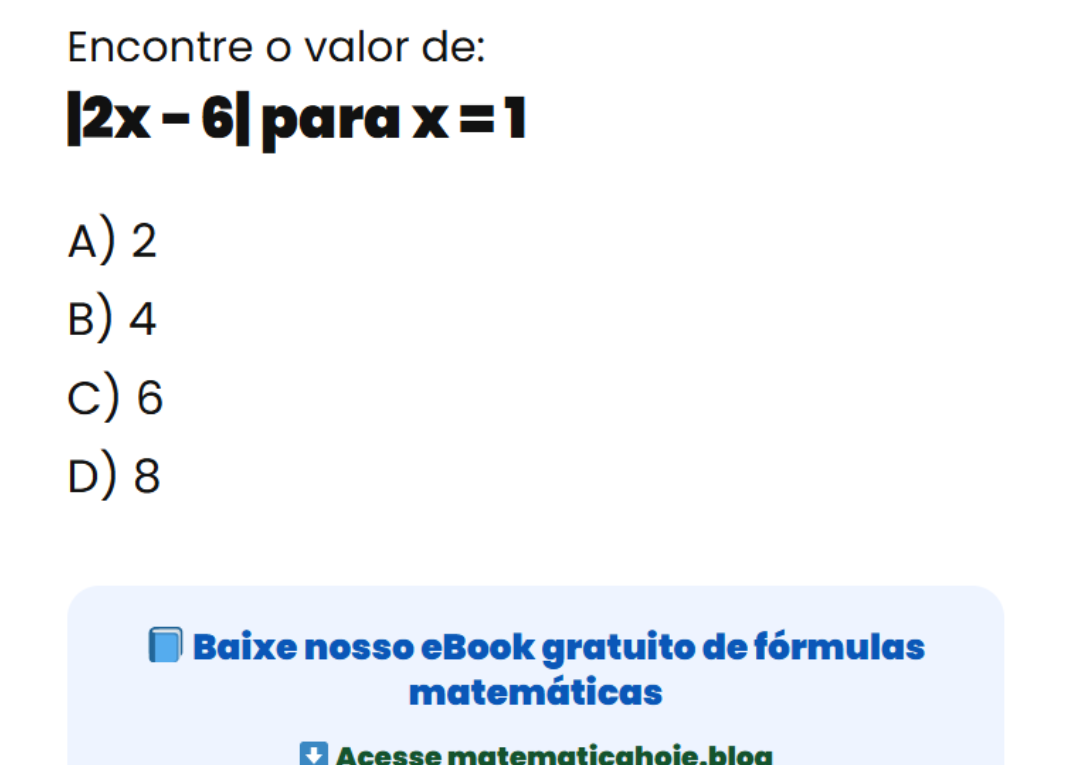 Continue lendo98% erram essa conta: calcule |2x − 6| para x = 1 Em valor absoluto, muitos estudantes erram ao aplicar