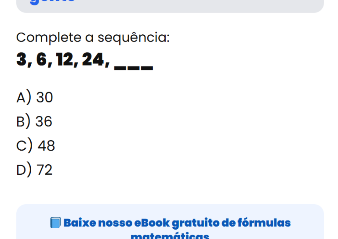 Continue lendoEssa sequência derruba muita gente: complete 3, 6, 12, 24, ___ Sequências numéricas aparecem muito em provas de raciocínio lógico