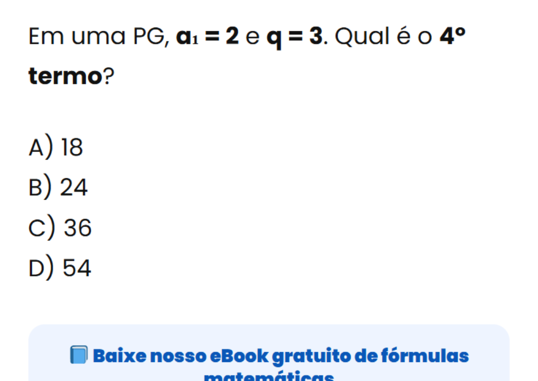 Continue lendoVocê acerta o 4º termo dessa PG? 📈 Em uma progressão geométrica (PG), usamos a fórmula aₙ = a₁ ·