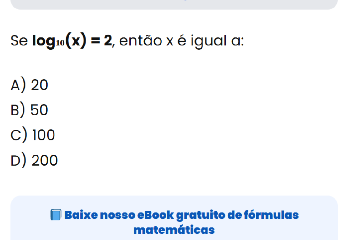 Continue lendoVocê acerta essa do logaritmo? 📘 Para resolver logaritmos, basta lembrar que log₁₀(x) = 2 significa que o número base
