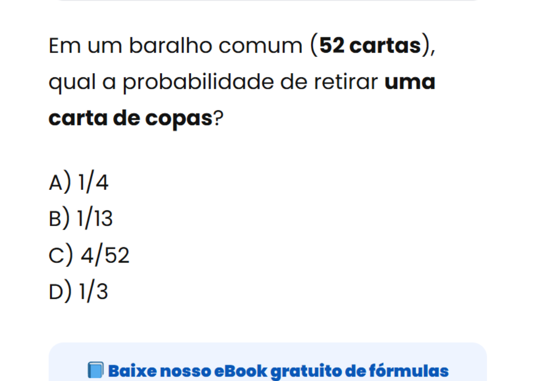 Continue lendoQual é a chance real de sair copas no baralho? 🂱♣️ Em problemas de probabilidade, dividimos os casos favoráveis pelo