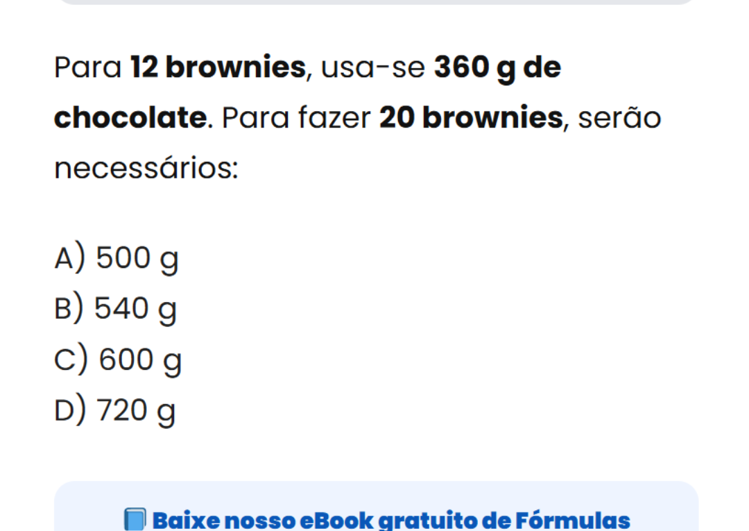 Continue lendoRegra de três com brownies: você acerta o chocolate para 20 unidades? 🍫🔥 Questões como essa envolvem regra de três