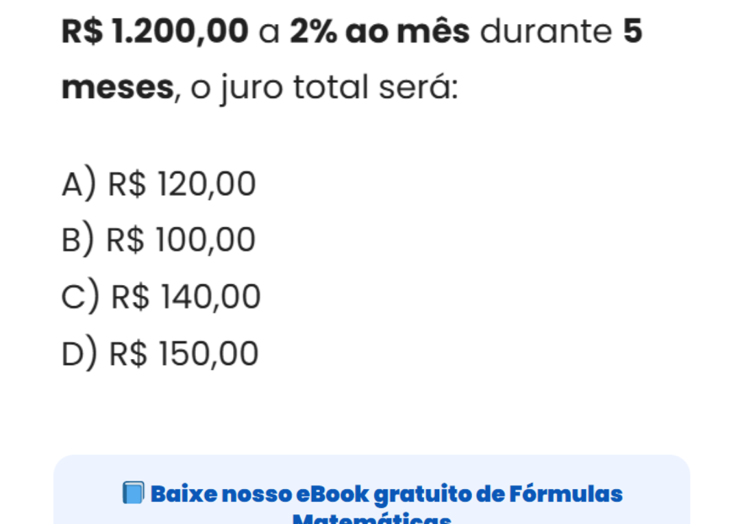 Continue lendoJuros Simples: cálculo do juro total Questões de juros simples aparecem com frequência em provas e no dia a dia