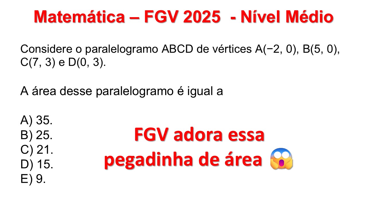 Continue lendoÁrea de Paralelogramo no Plano Cartesiano – FGV 2025 Matemática – FGV 2025 – Nível Médio Considere o paralelogramo ABCD