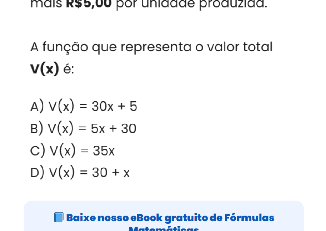 Continue lendoFunção Afim – Taxa Fixa e Valor por Unidade A função afim modela situações com taxa fixa e valor variável.