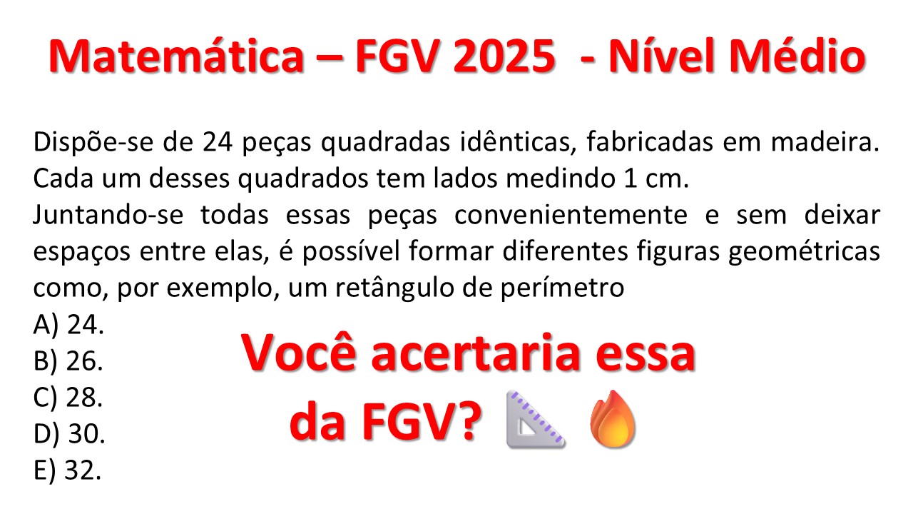 Continue lendoPerímetro de retângulo com 24 quadrados de 1 cm (FGV 2025) Matemática – FGV 2025 – Nível Médio Conteúdo: Geometria