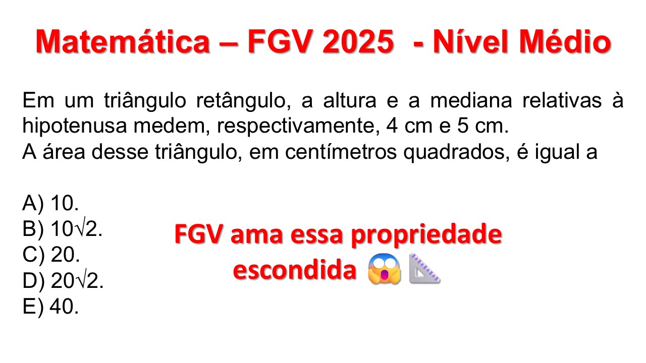 Continue lendoÁrea de triângulo retângulo com altura e mediana na hipotenusa (FGV 2025) Matemática – FGV 2025 – Nível Médio Conteúdo: