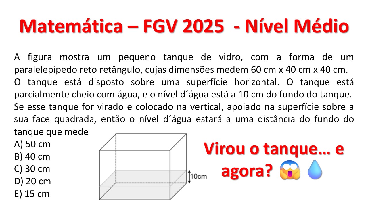 Continue lendoTanque de vidro virado na vertical – Conservação de volume (FGV 2025) Matemática – FGV 2025 – Nível Médio Conteúdo: