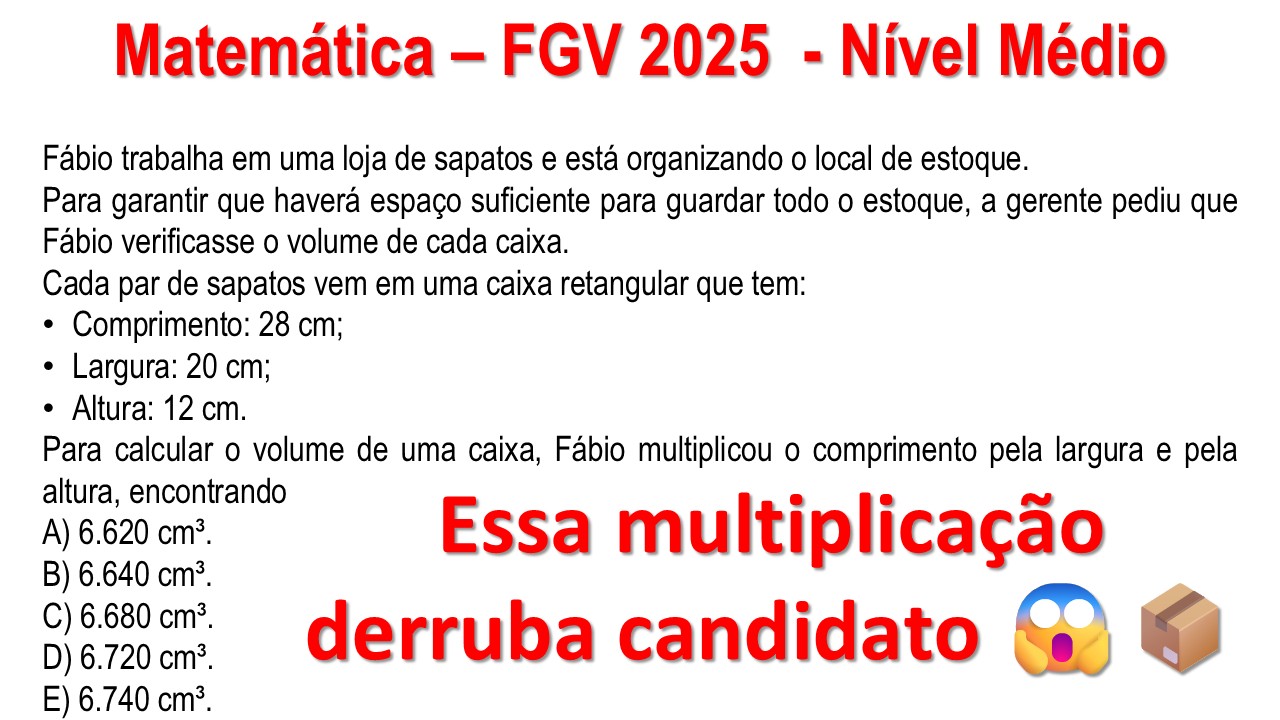Continue lendoVolume de caixa retangular – FGV 2025 Matemática – FGV 2025 – Nível Médio Conteúdo: Geometria Espacial — Volume de