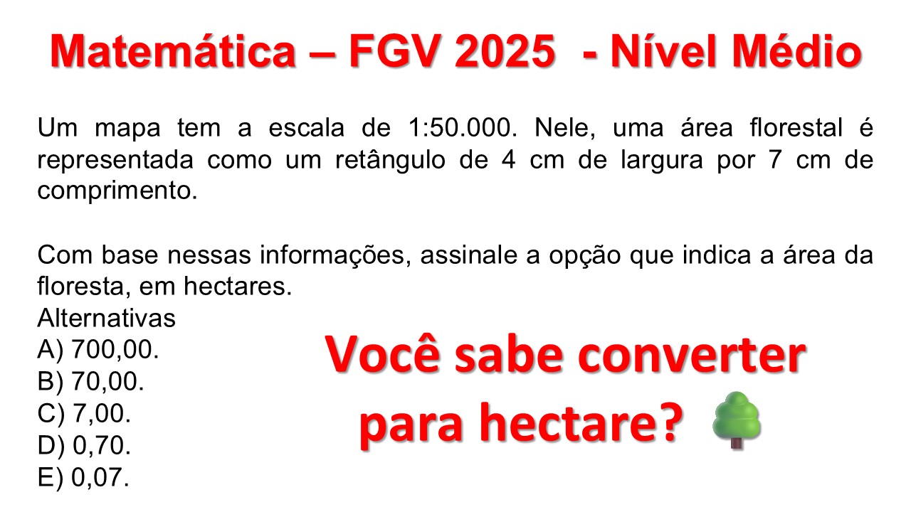 Continue lendoEscala 1:50.000 – Área real em hectares (FGV 2025) Matemática – FGV 2025 – Nível Médio Conteúdo: Escala e conversão