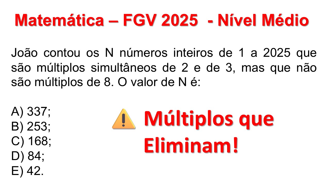Continue lendoContagem de múltiplos de 2 e 3, mas não de 8 – FGV 2025 Matemática – FGV 2025 – Nível