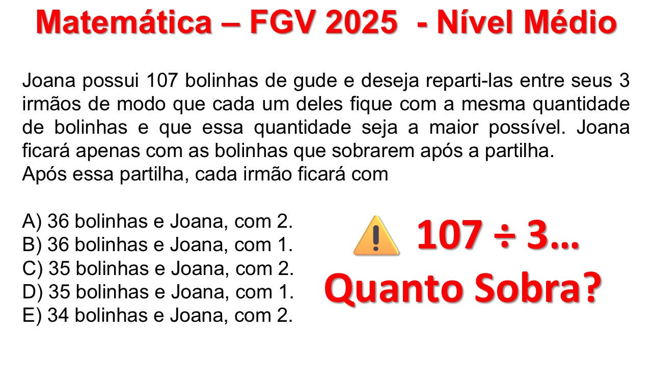 Divisão com resto – 107 bolinhas entre 3 irmãos (FGV 2025) Matemática – FGV 2025 – Nível Médio Conteúdo: Aritmética