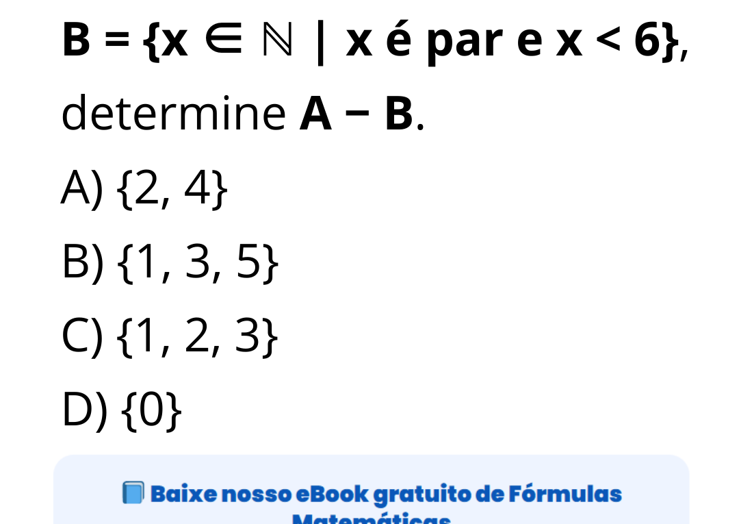 Continue lendoDiferença de Conjuntos em ℕ A operação diferença entre conjuntos é muito cobrada em concursos. Diferença de Conjuntos (A −