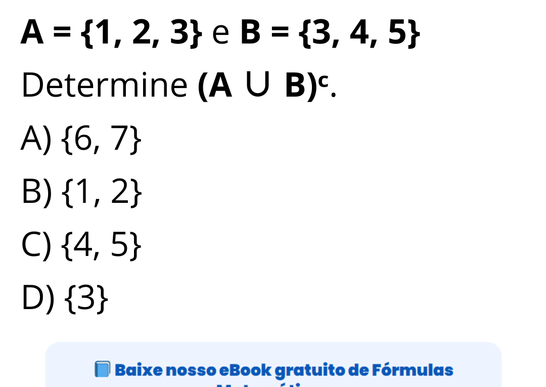 Continue lendoComplemento da União de Conjuntos Complemento da União – Conjuntos Matemáticos Considere: U = {1, 2, 3, 4, 5, 6,