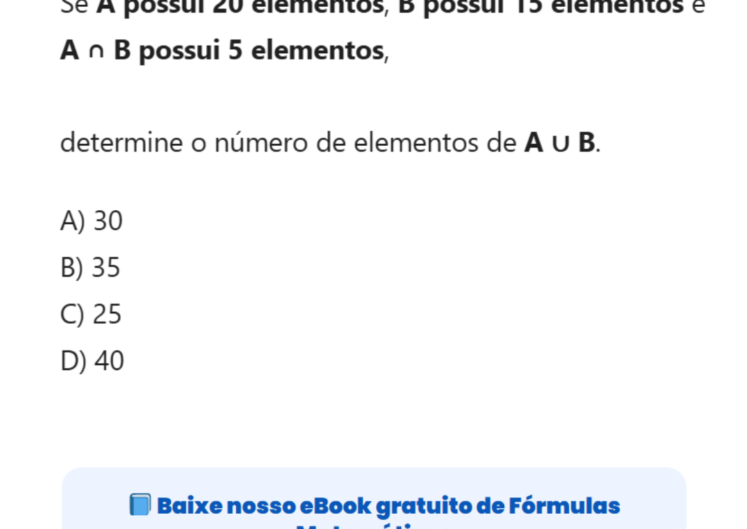 Continue lendoUnião de Conjuntos – Número de Elementos União de Conjuntos – Princípio da Inclusão-Exclusão Se A possui 20 elementos, B