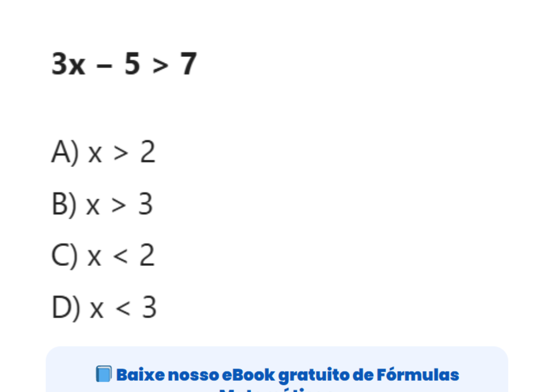 Continue lendoInequação do 1º Grau – 3x − 5 > 7 Inequação do 1º Grau – Resolução Passo a Passo Resolva